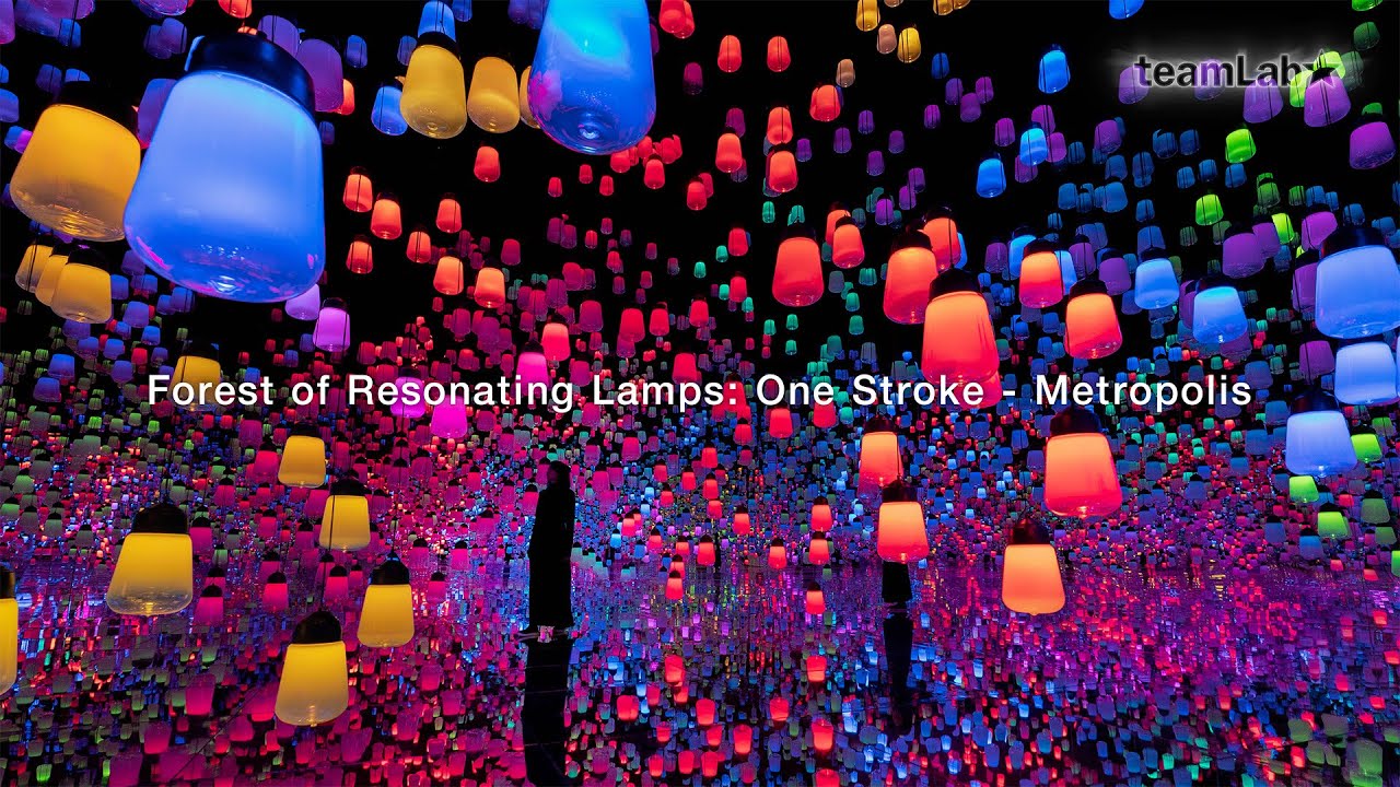 teamLab’s Forest of Resonating Lamps: One Stroke is an interactive installation composed of Murano glass lamps suspended at varying heights in a mirrored room. When a person stands still close to a lamp, it shines brightly and emits a sound, spreading light to the two closest lamps. The light divides in two and passes through all lamps once, creating a single trajectory. The lamp arrangement is mathematically determined so drawing a line between closest lamps creates a unicursal stroke with the same starting and ending point. Light will always pass through every lamp exactly once before returning to the original starting point. Seasonal variations include Cherry Blossoms, Wisteria, Summer Forest, Ice Cave, and Fire, each featuring colors inspired by traditional Japanese Kasane no Irome layered colors. First presented at Maison et Objet Paris in 2016.